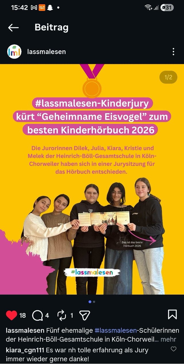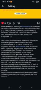 Die Verantwortliche für das Kinder- und Jugendprogramm, Annika Furtkamp, würdigte das Engagement der teilnehmenden Schüler:innen als enorm wichtigen Beitrag angesichts des Debakels der PISA-Studie, da sie durch ihr Mitwirken dazu beitragen, ihre Mitschüler:innen für Bücher zu begeistern. „Darauf können wir echt stolz sein!“, meinten unsere Schüler:innen. Nach einem Fototermin und interessantem Austausch mit den anderen Teilnehmern ging es zurück nach Chorweiler, natürlich nicht ohne einen Abstecher zum Weihnachtsmarkt.