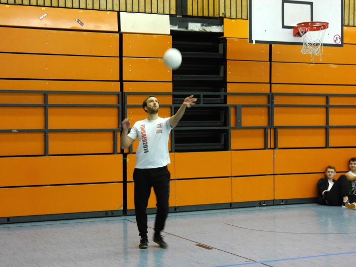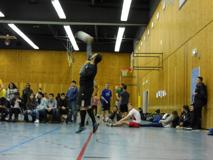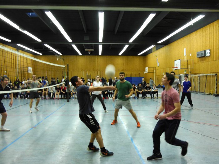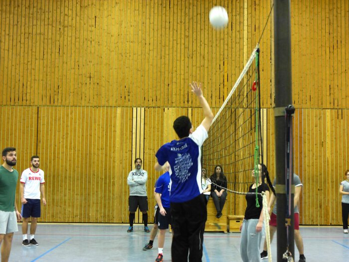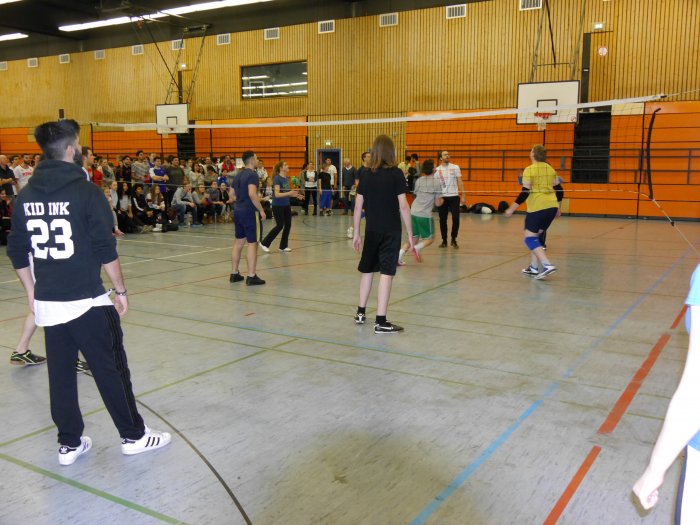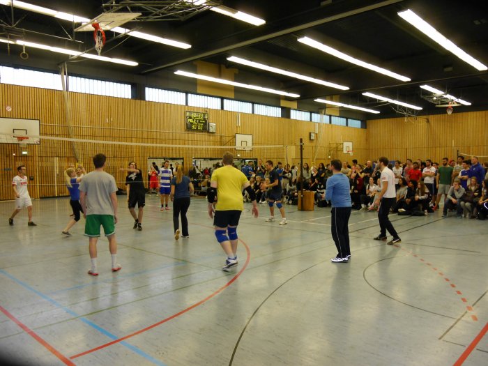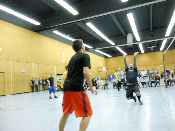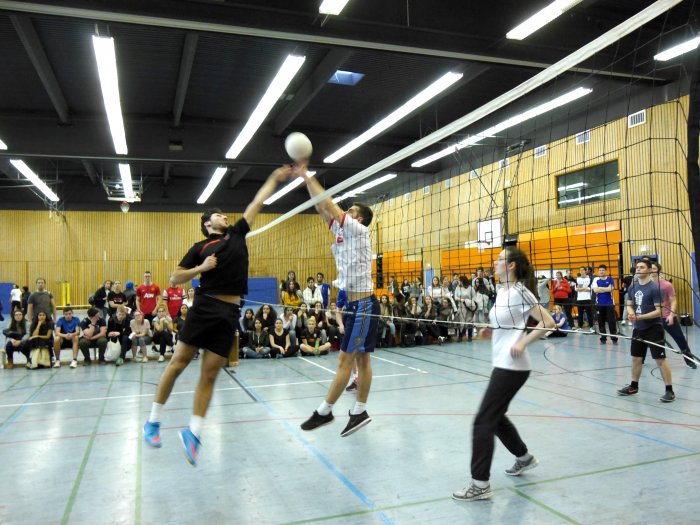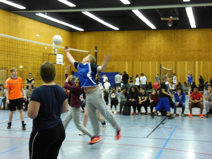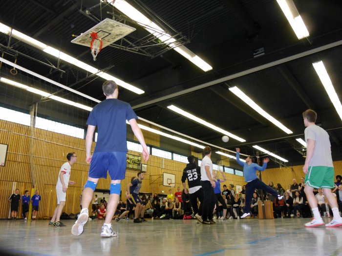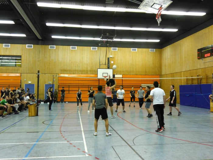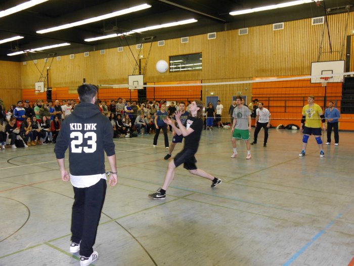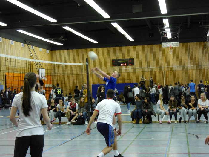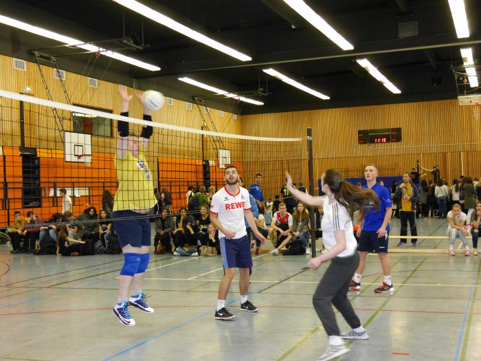 schon zum dritten Mal in Folge fand auch in diesem Jahr am letzten Schultag das Volleyball-Turnier der Oberstufe statt. Insgesamt 26 Mannschaften (daruter auch eine Referendars- und eine Lehrermannschaft) traten am Dienstag, den 22.12.2015 ab kurz nach 8 gegeneinander an. Jede Mannschaft musste sich in 4 Gruppenspielen als Erster oder Zweiter der Gruppe für das Viertelfinale qualifizieren. Die Lehrermannschaft, die sich in den vergangenen beiden Jahren durchsetzen konnte, schied schon im Viertelfinale aus. Im Finale standen sich dann 2 Mannschaften aus dem Leistungskurs Sport der Stufe 13 gegenüber.