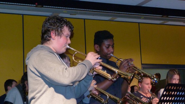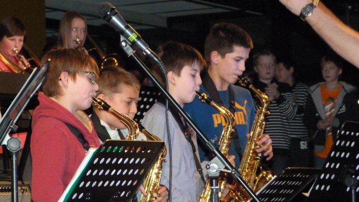 Eröffnet wurde das Konzert mit der BigBand des 5.Jahrgangs. Mit Querflöten, Saxophonen, Trompeten, Gitarren und Schlagzeug zeigten die jungen Musikerinnen und Musiker, was sie im ersten halben Jahr auf ihren Instrumenten und vor allem auch im Ensemble unter Leitung von Herrn Wiedemann erarbeitet hatten.