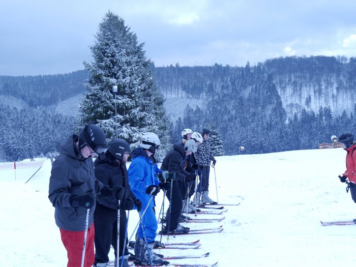 Und dann ging es um ca. 10:30 Uhr mit dem Skifahren los. In kleineren Gruppen wurden von den beiden LK-Lehrern Herr Wiedemann und Frau Dittmar und von vier anderen Lehrkräften (Herr Finsterbusch, Herr Dirks, Frau Drosihn und Frau Röllgen) die ersten Schritte erklärt und ausprobiert, wie die vermeindlich langen Bretter an den Füßen funktionieren. Eine Gruppe mit bereits erfahrenen Schülerinnen und Schülern legte direkt mit Abfahrten und Übungen los. Die nächsten zwei Stunden wurde geübt, gekurvt und auch hingefallen und das in jeder der Gruppen. Stufengemischte Teams ließen die Teilnehmer mit Mitschülern aus der anderen Stufe zusammentreffen, was allerdings nirgends ein Problem darstellte.